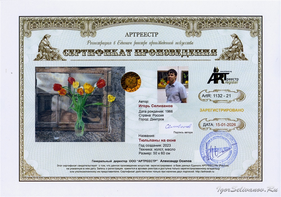 тюльпанов и создавая сложную игру тёплых и холодных оттенков.Селиванов демонстрирует эволюцию своего метода: многослойная живопись обретает здесь новую степень свободы и выразительности. Эта картина воспринимается как гимн вечному возрождению природы, где в суровых рамках человеческого бытия расцветает хрупкая и торжествующая красота, преображающая пространство вокруг себя. Фуфаев Д. Э. (2025)