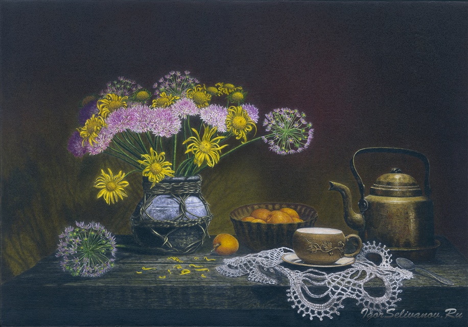 Художник мастерски передает контраст между солнечной энергией цветов и воздушной легкостью текстиля. Особую динамику композиции придает соцветие декоративного лука, чьи невесомые формы создают сложный ритм и обогащают пространственное решение работы. Цветовую гармонию поддерживают акценты оранжевых абрикосов, вносящих теплое звучание, в то время как металлический чайник и крашеная под металл чашка на переднем плане добавляют композиции весомости и завершенности.