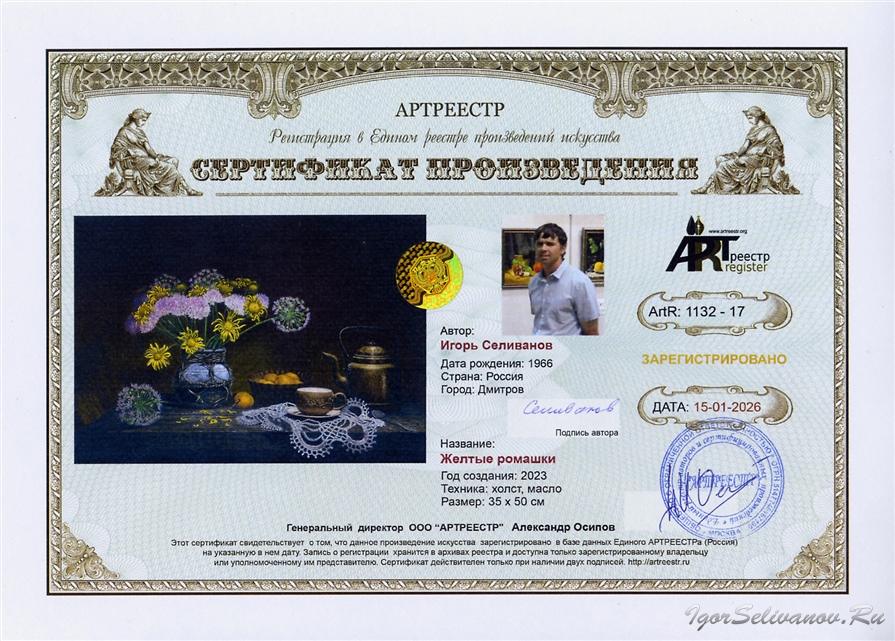 «Желтые ромашки» 2023 года представляет собой зрелое и многогранное произведение Игоря Селиванова, в котором художник демонстрирует виртуозное владение техникой многослойной живописи. На полотне разворачивается изысканная пластическая поэма, где каждый элемент наделен своим характером и голосом.